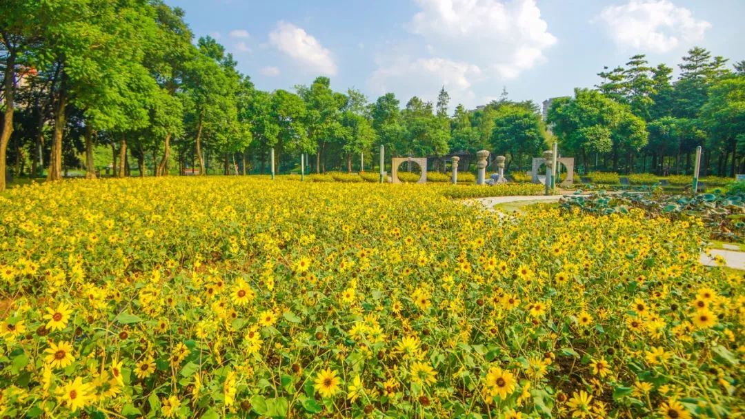 亚艺公园的禅荷花岛2000㎡向日葵、醉蝶花等靓丽时花绽放,本次在亚艺公园种植的向日葵,是首次在禅城引种的特殊品种。
