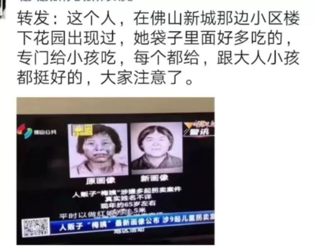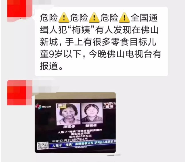 该消息大概意思是:全国通缉人贩“梅姨”出现在了佛山新城某小区,还拿着零食“诱惑”小朋友,目标儿童9岁以下。