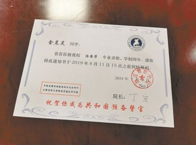 近日,金晨昊以总分601分、多出浙江警察学院综合录取分数线27分的好成绩被该校录取。