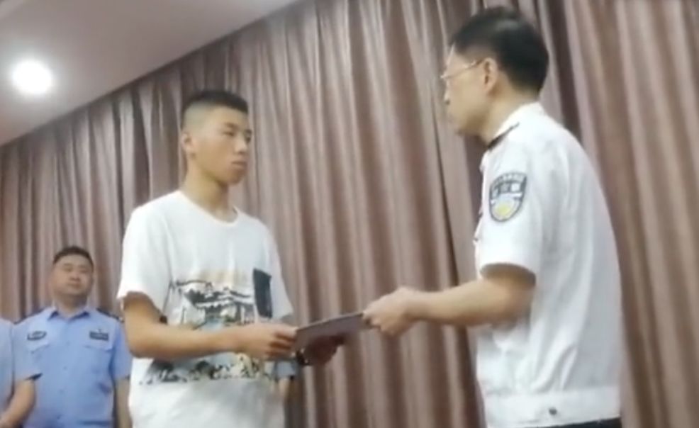 “恭喜你,你的努力得到了回报!”7月9日上午10点,浙江警察学院教务处处长许韬亲手将编号为“001号”的录取通知书交到了金健勇之子金晨昊手中。