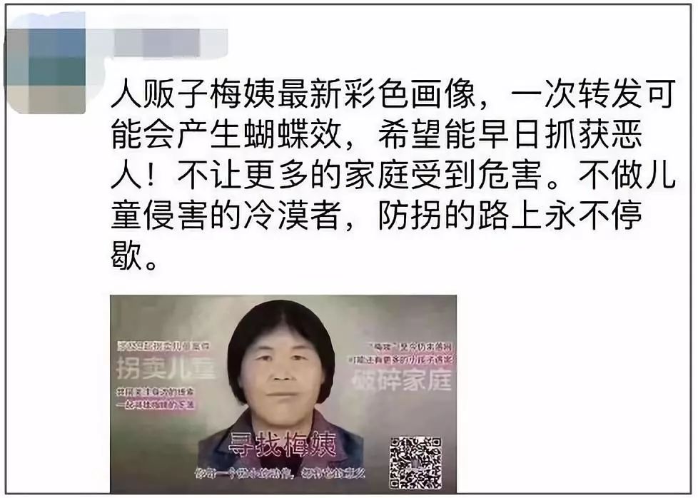 近日,一张呼吁大家寻找人贩子“梅姨”的图片在朋友圈广泛流传↓↓↓