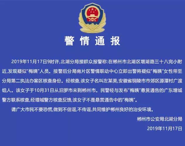 此外,关于网上流传的“梅姨”在湖南郴州落网的消息,昨日(11月17日)郴州市公安局北湖分局发布警情通报称,该女子不是悬赏通告中的“梅姨”,目前左某美已经离开郴州市公安局北湖分局。