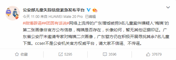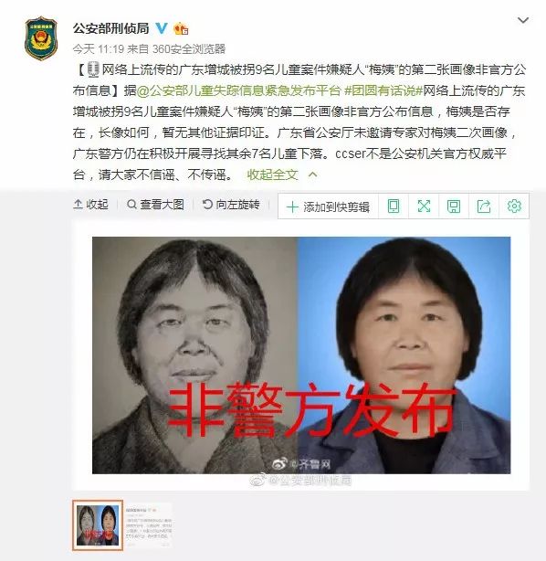 2019年11月18日,公安部儿童失踪信息紧急发布平台官方微博消息,目前,网络上流传的广东增城被拐9名儿童案件嫌疑人“梅姨”的第二张画像非官方公布信息,梅姨是否存在,长相如何,暂无其他证据印证。