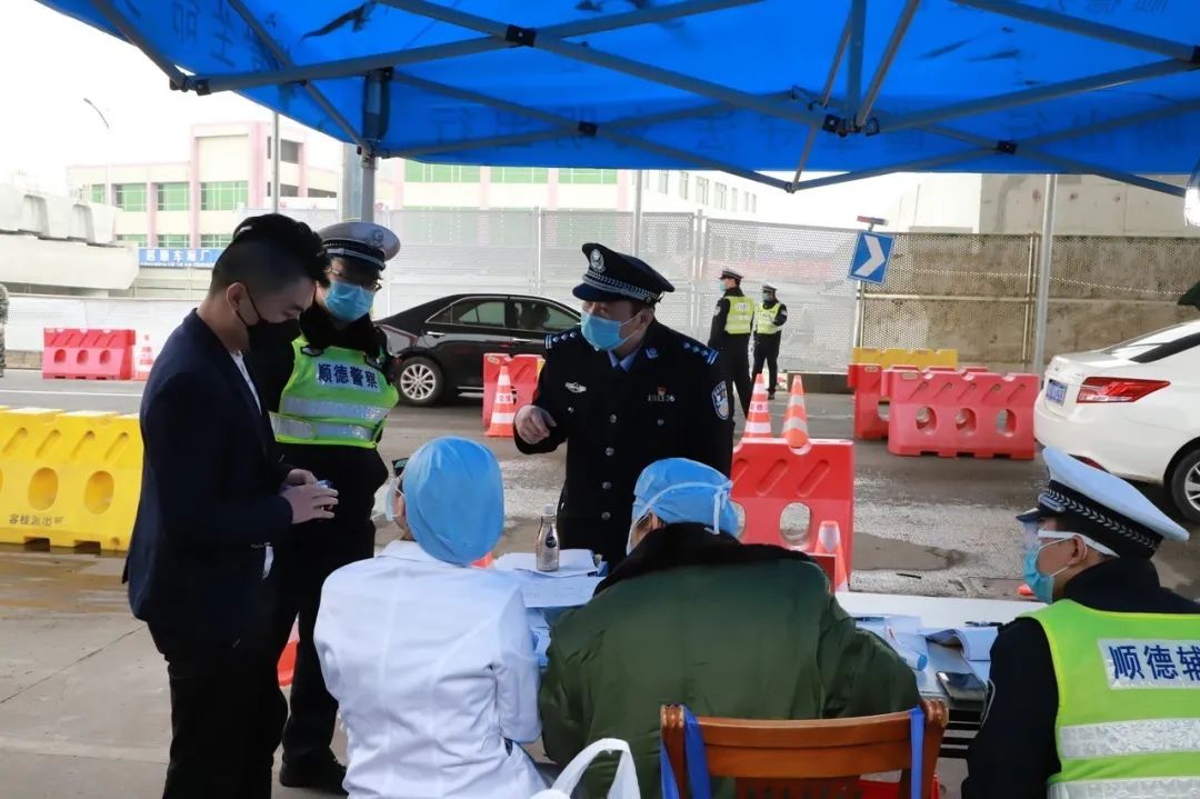 汪刚(后排右一)在105国道容桂南头路口联合检疫检测站指导一线防疫工作。/顺德警方供图