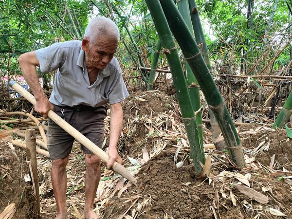 昨日清晨6时,伴着鸟鸣声,77岁的陈根就踩着自行车,来到东平河畔的自家竹笋地。拿起铁锹和一个因长久敲击而变了形的木槌,他走进竹林深处,赤脚踩过落满竹叶的沙地,发出“沙沙”的响声。