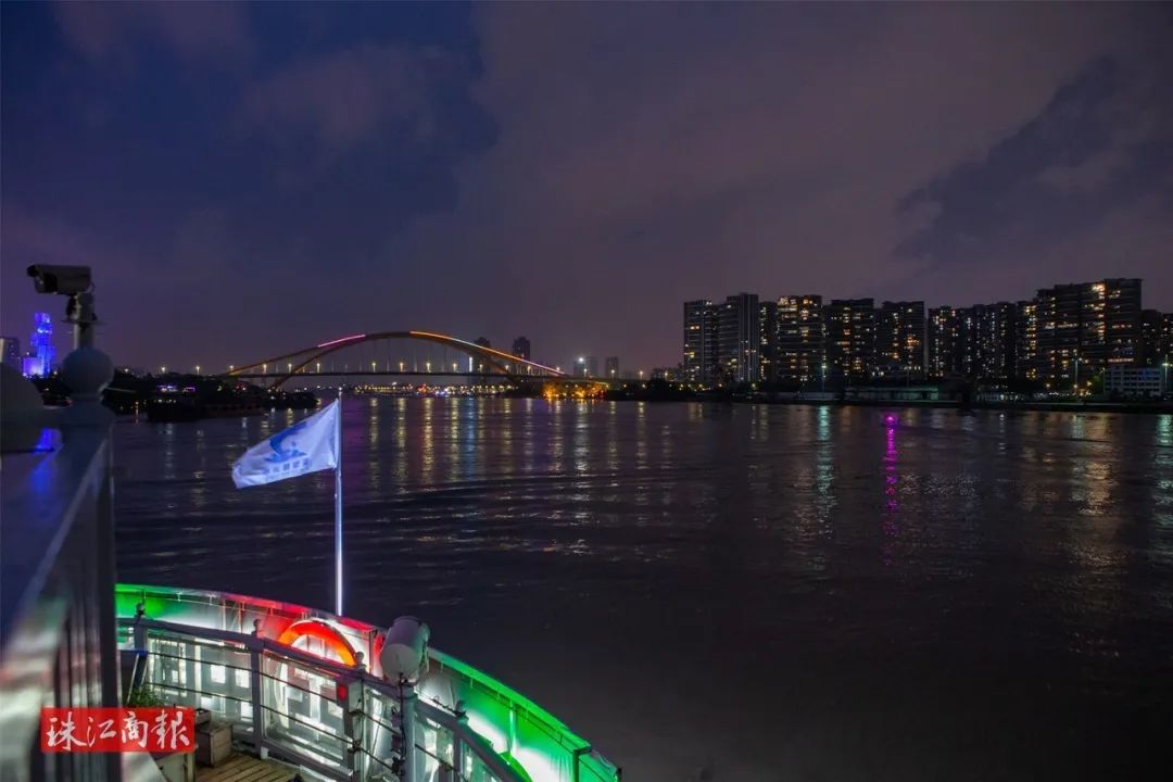 6月8日,潭洲水道游船试航,游船在潭洲水道穿行,岸边的三龙湾高端创新集聚区灯火璀璨。/珠江商报记者林安迪摄