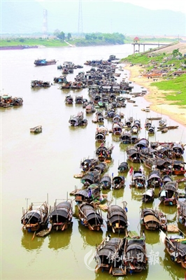 油金大桥附近,密密麻麻停放着深色的小渔船,甚是壮观。