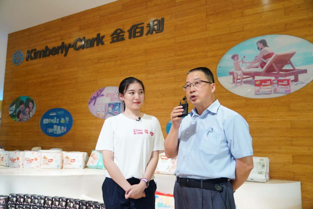 8月30日,拼多多“母婴产品溯源行动”落地国际知名纸尿裤品牌好奇南京工厂,厂长肖世平(右)向网友介绍此次活动。(穆功 摄)