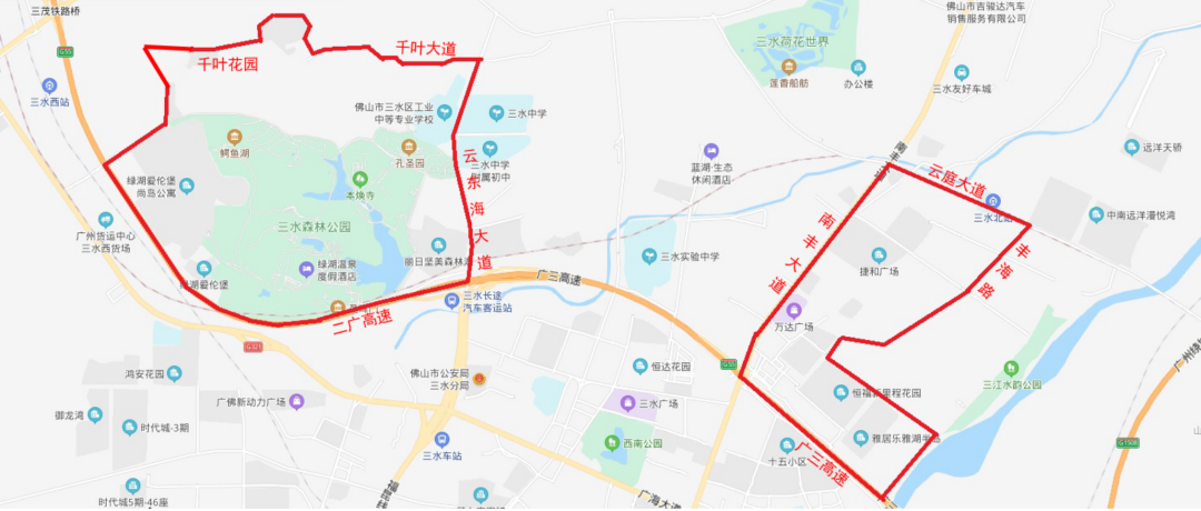 三水划定七个镇街11个片区为养犬管理城市市区范围,包括西南街道、云东海街道(分2个片区)、白坭镇、乐平镇(分4个片区)、芦苞镇、大塘镇、南山镇等区域。