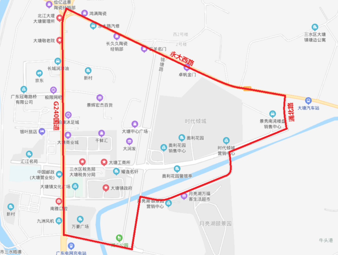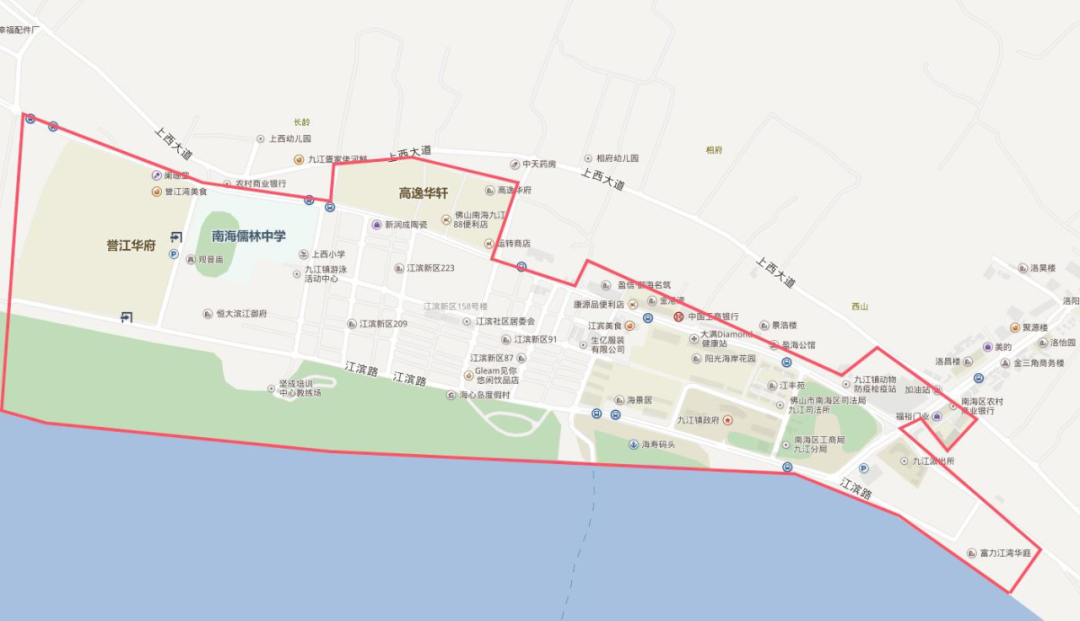 北至新堤西路、南至江滨路、西至誉江华府、东至富力西江十号。上述区域所提及的道路路段指道路沿线两侧的第一排建筑及沿途物业小区。