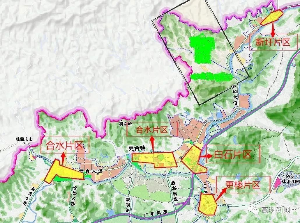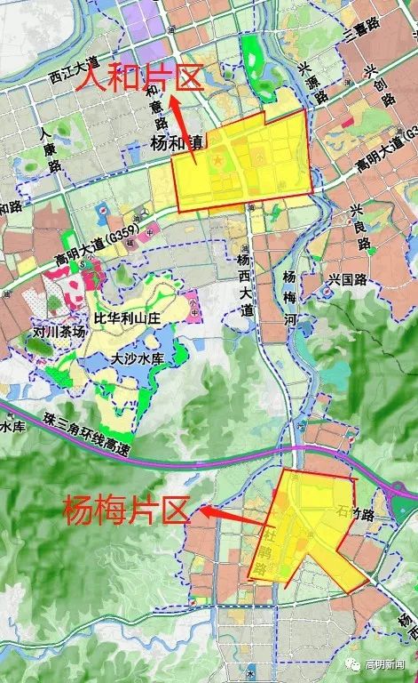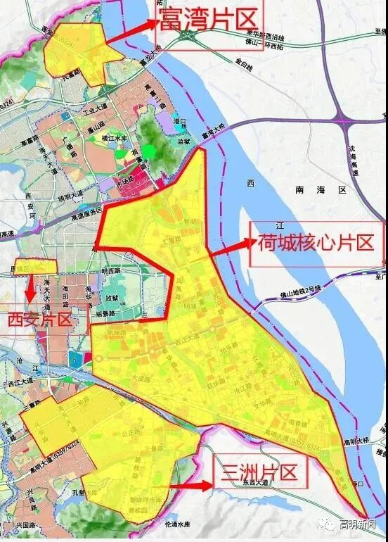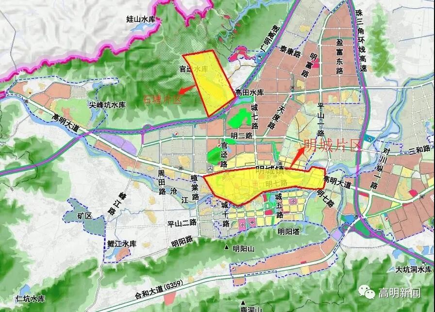 高明划定中心城区核心区、三洲片区、西安片区、富湾片区、杨梅片区、人和片区、明城片区、石塘片区、更楼片区、白石片区、新圩片区、合水片区为城市市区范围。