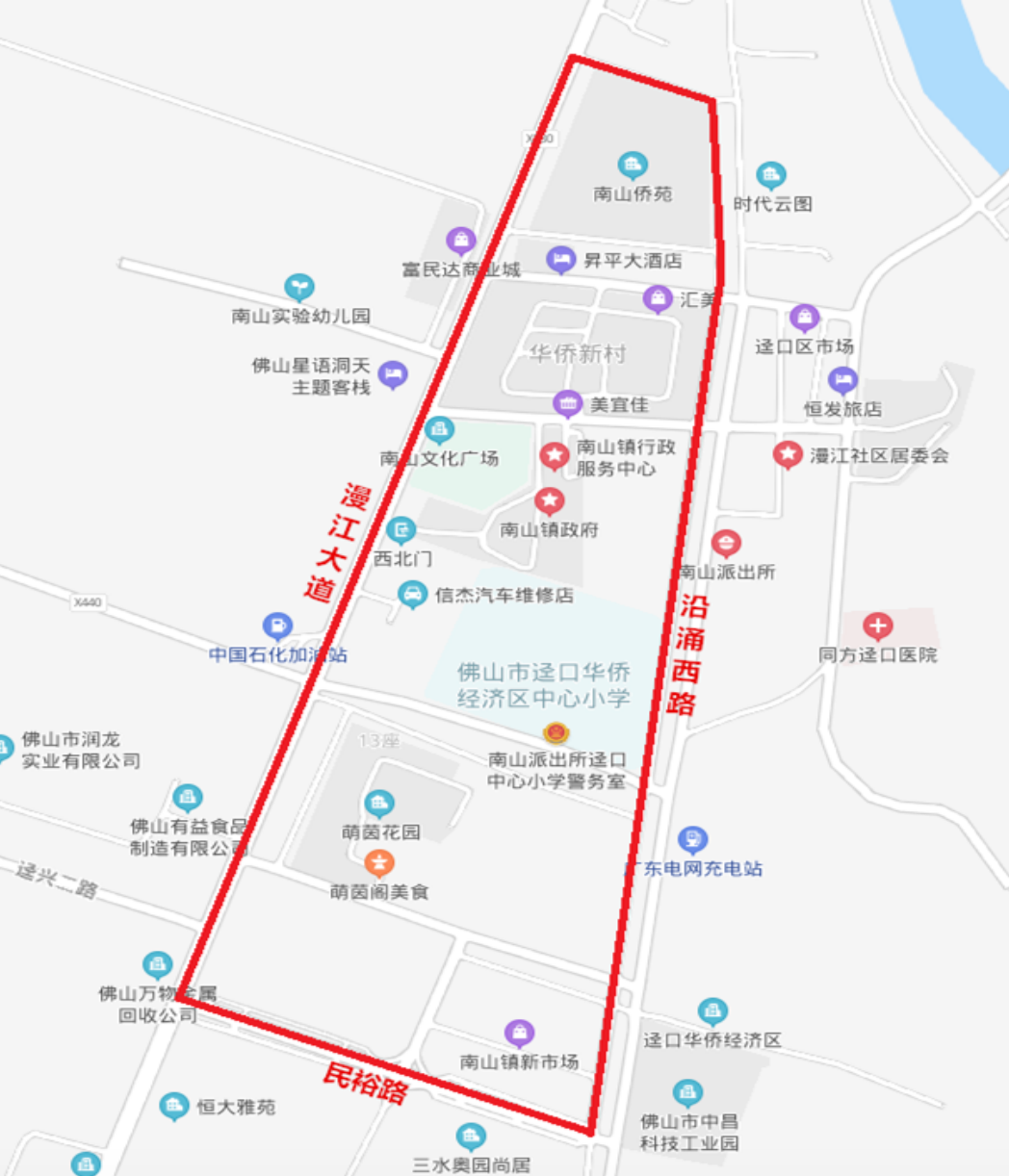 丹灶社区:东至丹灶大道官山涌,南至海安路及工业大道(包括碧桂园),西至樵丹路,北至桂丹路;