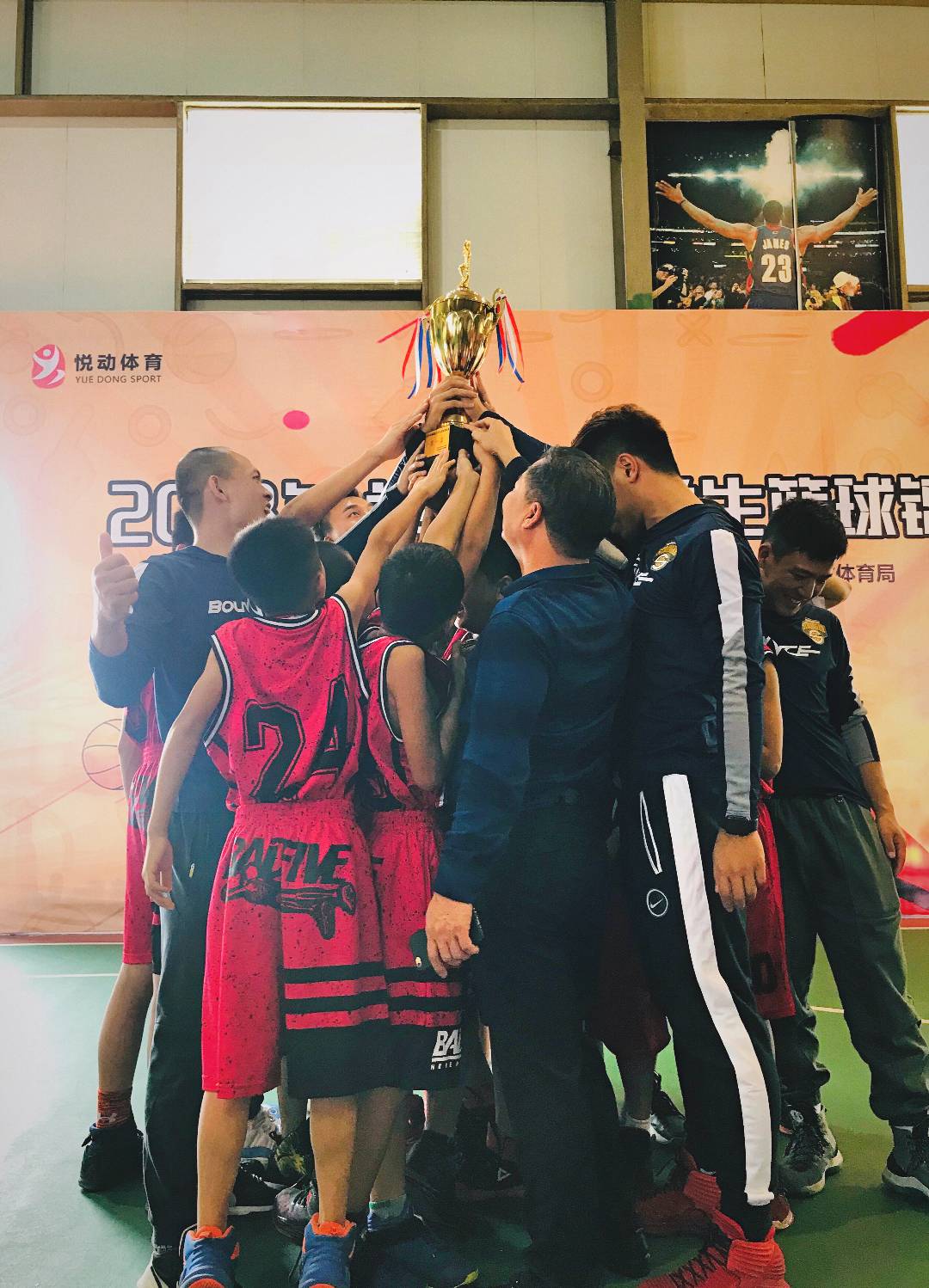 佛山市禅城区南庄镇溶洲小学篮球队在2018年禅城区男子篮球锦标赛上卫冕冠军,赛后球队与奖杯兴奋合影。/学校供图