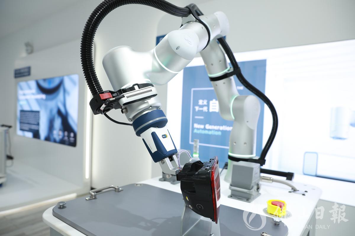 非夕科技展厅内展示的机器人拂晓RIZON可以自适应安装车灯排线。/佛山日报记者张弘弢摄
