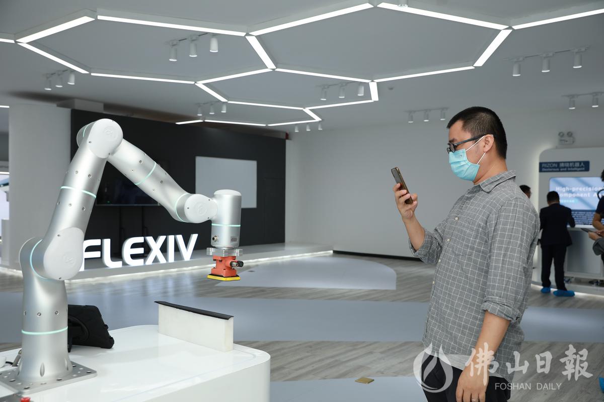 非夕科技展厅内展示的机器人拂晓RIZON可以自适应打磨曲面工件,吸引观众拍照。/佛山日报记者张弘弢摄