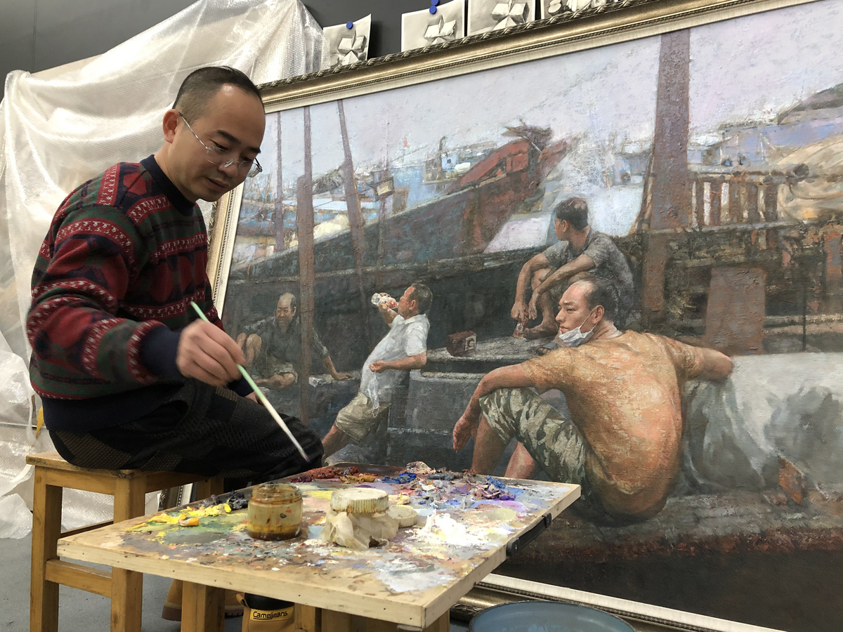 “落笔成画不是我对油画创作的追求,而是在反复修改中找到触及灵魂的画面。这跟我们的人生一样,在磕磕碰碰中才能不断校准自己的追求。”画室里,那个说话的男子手拿油画刀,刀尖在颜料层上涂抹,层层色块在亚麻布上或重叠、或剔除,目光所及之处,正是他未完成的《复工后的小息》——