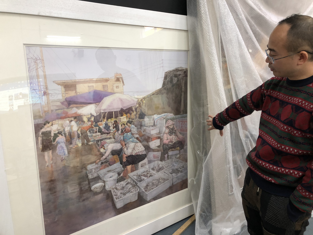 邢晓煌在对自己的油画作品进行修改。/佛山日报记者杨立韵摄