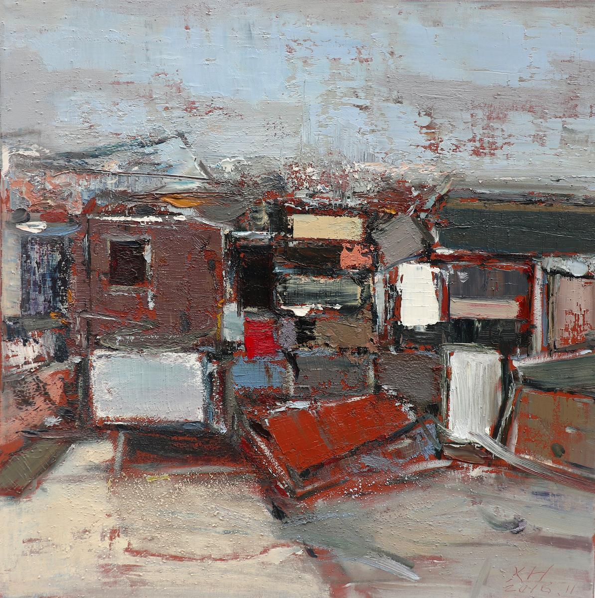 细看整个画面,这与邢晓煌以故土或家园为题材创作的油画风格迥异。可以感觉,画布之上,色彩的变化尤为清晰,肌理的变化尤为着力。视觉之中,越是鲜艳明亮的色块,越能拉近观众与画中人物的距离,越是灰暗苍白的色块,越能将画中的后景拉远。