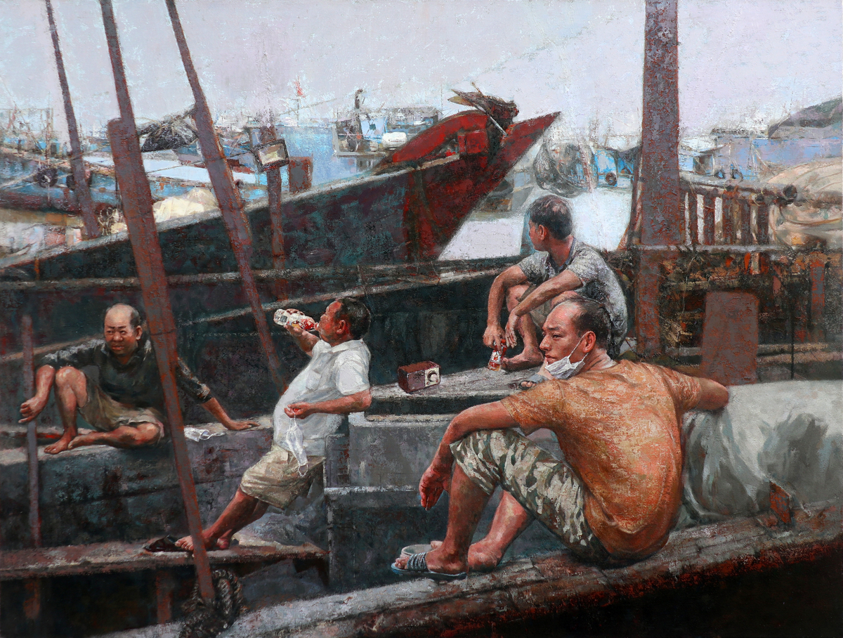 去年春天,邢晓煌着手创作一幅名为《复工后的小息》的油画作品。作品从新冠肺炎疫情常态化防控中取材,呈现的是海边渔港的船工在休息之际的画面。近处休憩的船工,稍远处泊靠的渔船,更远处是有点看不清的海平面与天际线。