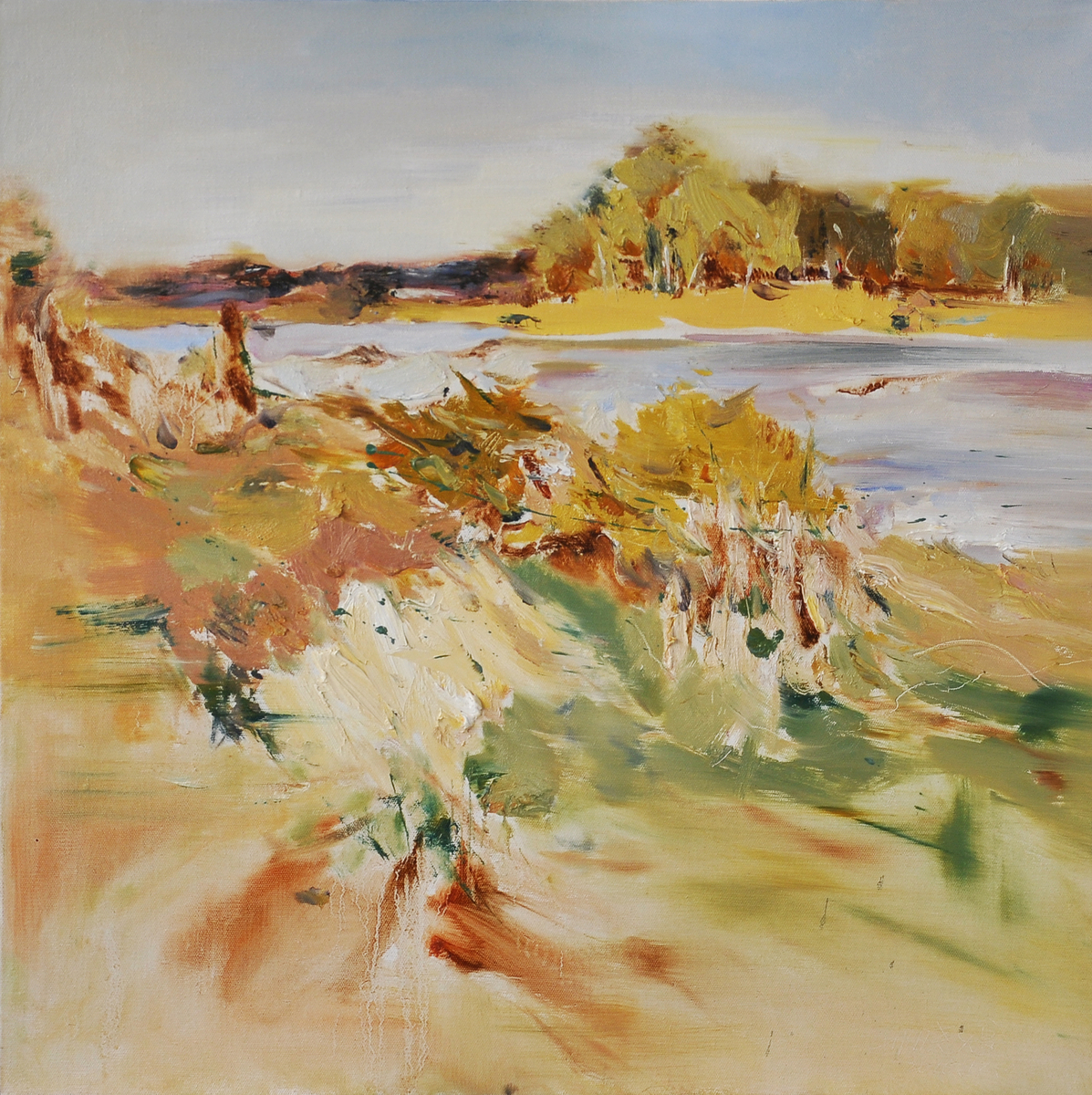 另一幅取名叫《记忆犹新》,同样借鉴表现主义的绘画风格,画的前景同样有摇曳林影与如茵绿草,后景同样是高天流云与远山叠翠,前后景之间盘桓着一面宽阔的湖。只是这次,在远景之中多了几所房子,原本静极了的画面,也因为这几处人家而点染了分外的温馨。