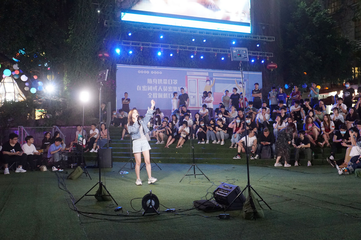 最受年青人喜欢的街头艺人表演区。图为在街头艺人表演区演唱的艺人。/佛山日报记者谭兼之摄