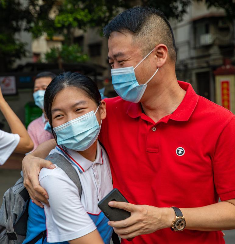 佛山一中考点门口,家长与走出的孩子紧紧相拥。佛山日报记者周春摄