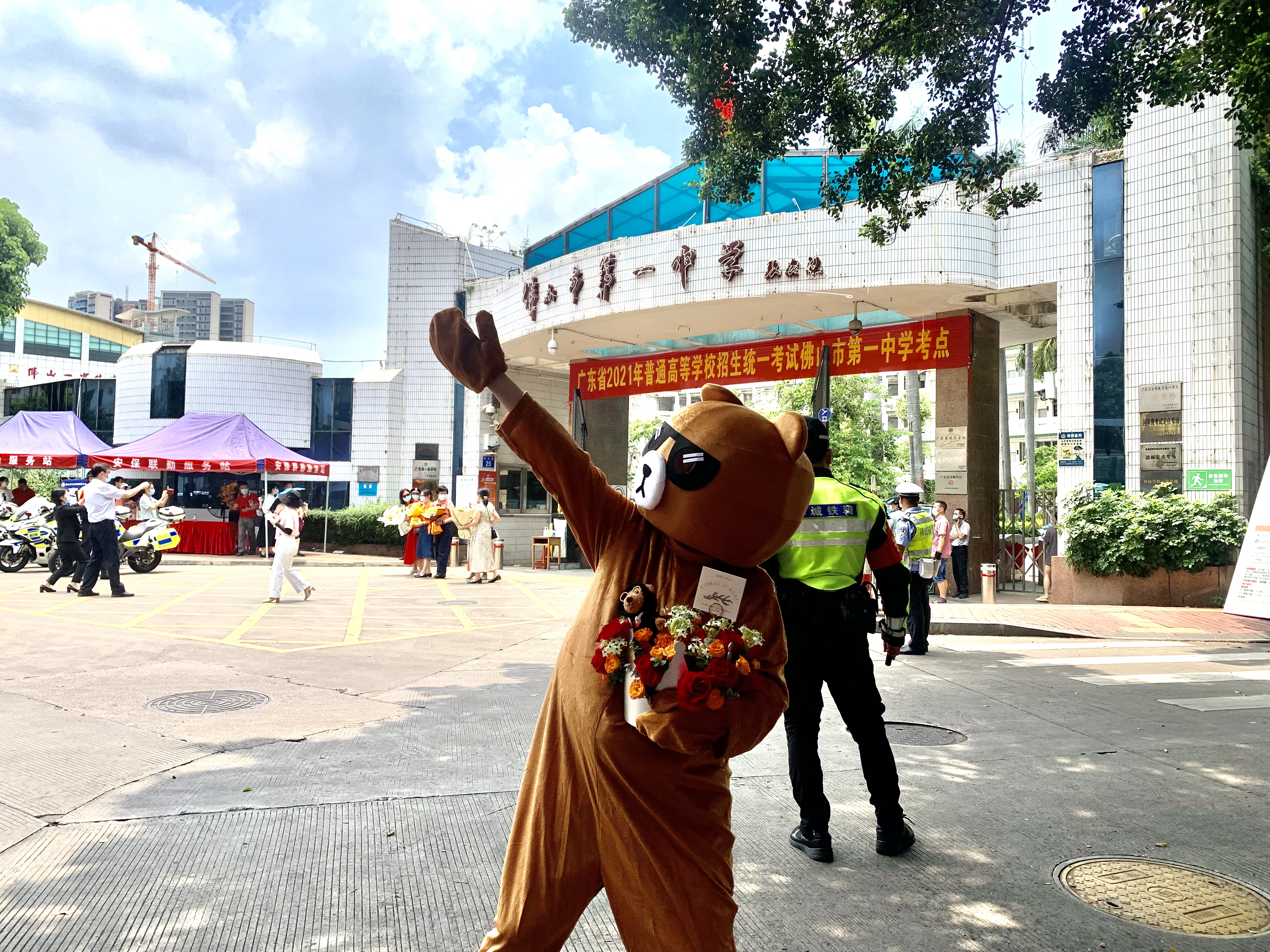 家长麦妈妈穿上了网红熊装扮在校门口等孩子凯旋。/佛山日报记者苏宏堃摄