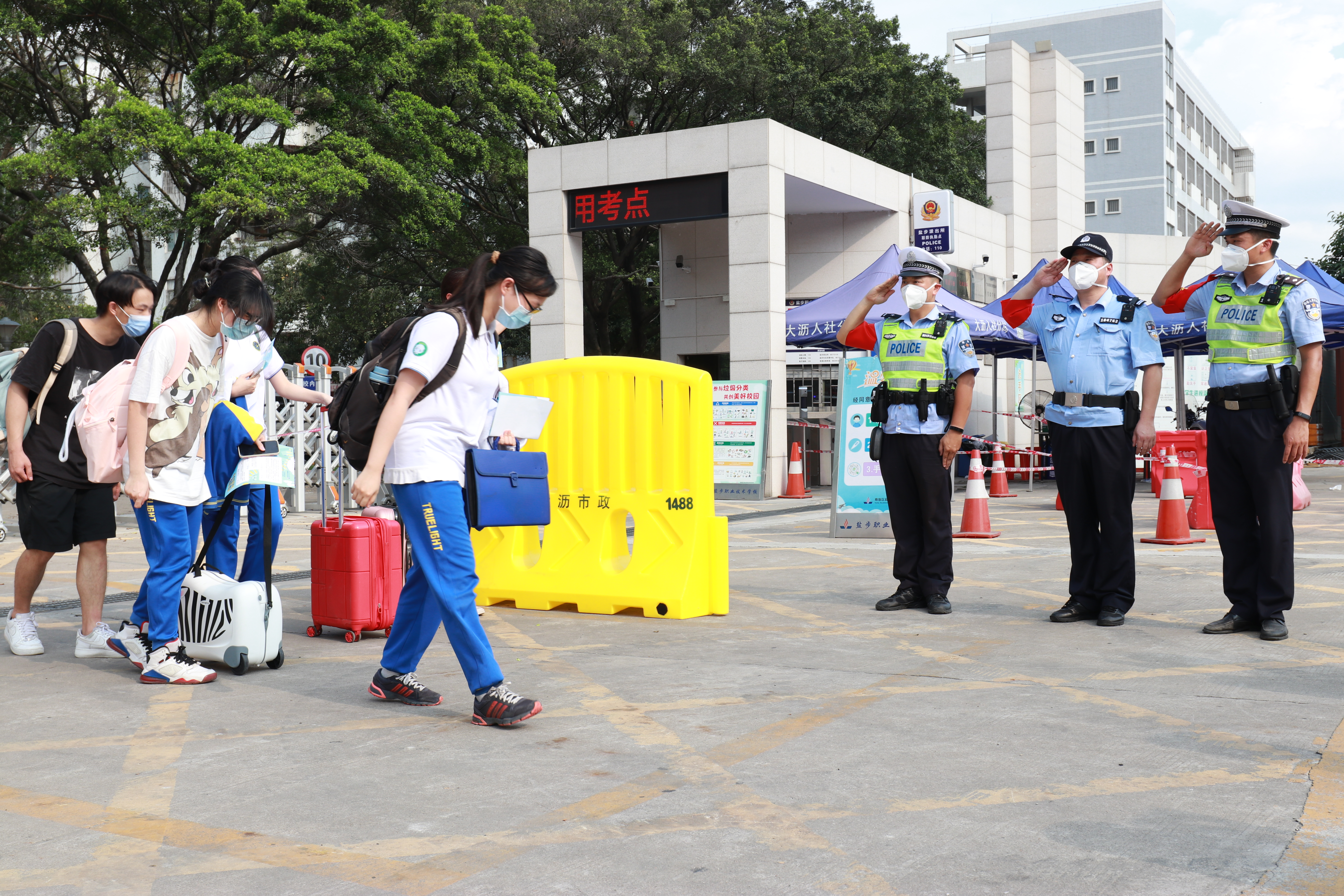 另一边,9日下午伴随考试结束钟声响起,在南海盐步职校考点完成“人生大考”的广州考生从容走出考场,向值守考点的警辅人员鞠躬致谢。警辅们则向考生们还以敬礼,对他们送上最真挚的祝福,温暖人心。