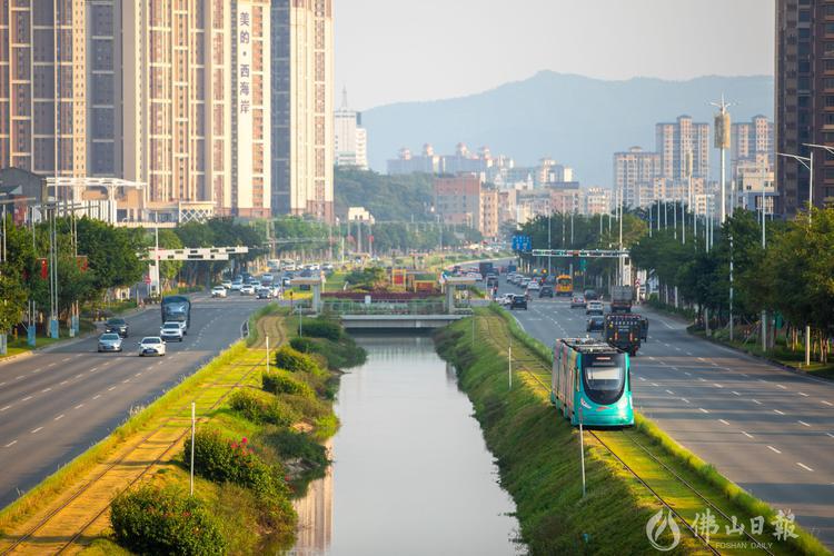 荷富大道上,高明有轨电车行驶着,为市民出行提供便利。