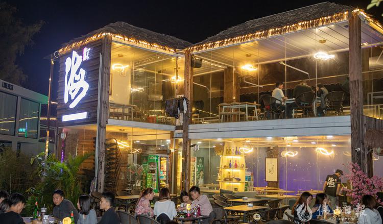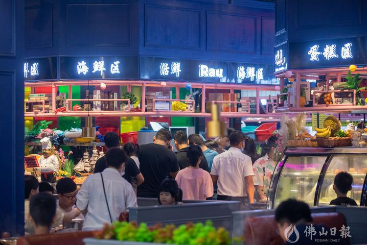当夜幕降临,高明滨荷Park逐渐迎来消费的群众。霓虹灯照亮西江沿岸,也丰富了市民的夜生活。图为消费者在餐饮店享用烧烤。