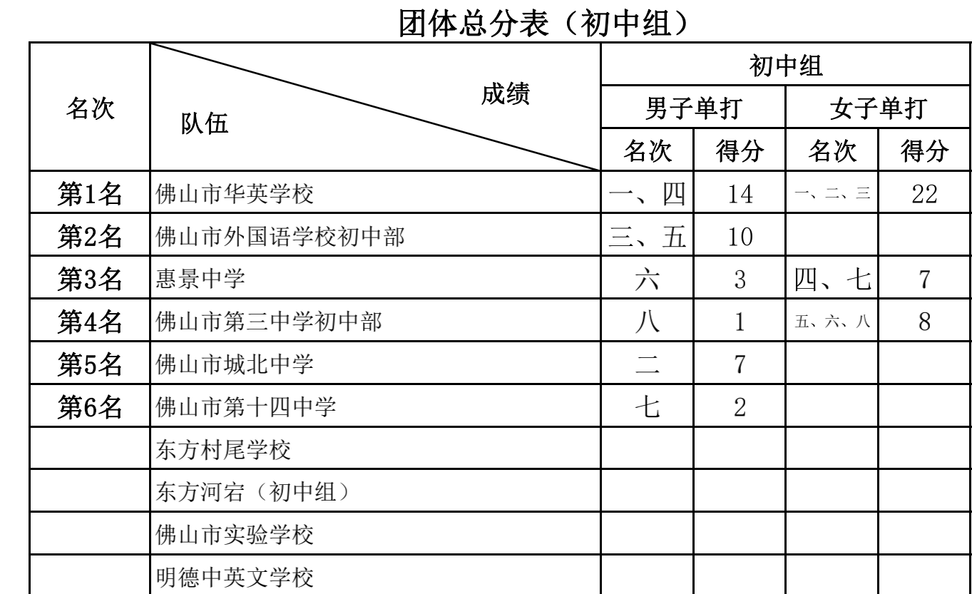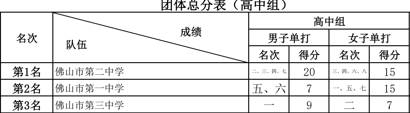 经过2天紧张激烈的角逐,各组别名次落定。佛山市禅城区南庄镇中心小学获得团体总分第一名,佛山市禅城区绿景小学、禅城区奇槎小学获得小学组分列二三名。初中组方面,佛山市华英学校获团体总分第一名,佛山市外国语学校初中部、惠景中学分列二三名。高中组方面,佛山市第二中学获得团体总分第一名,二三名则由佛山市第一中学、佛山市第三中学获得。