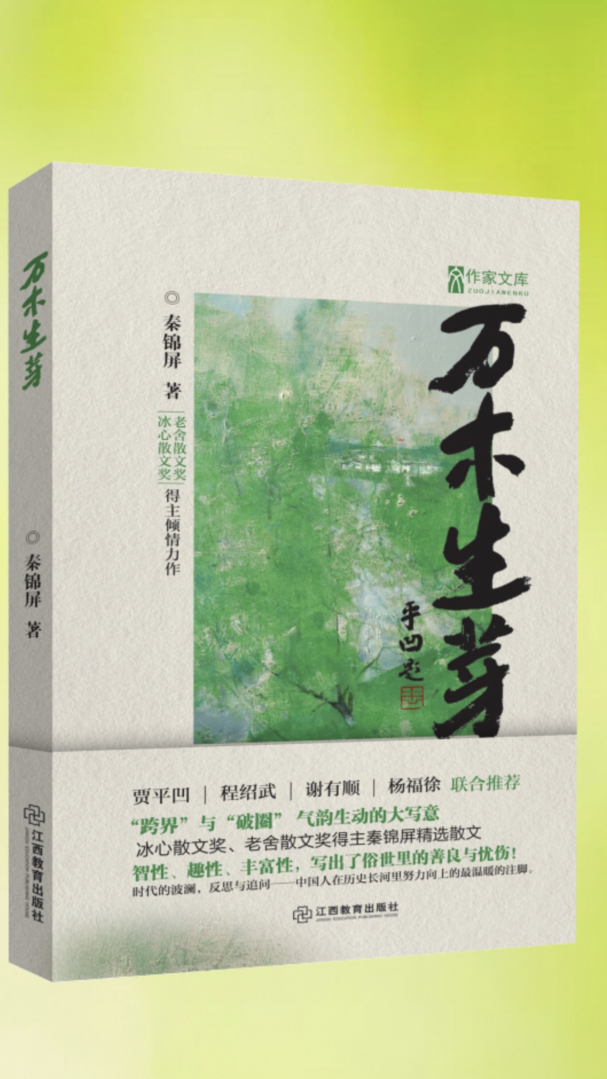 秦锦屏是国家一级作家、编剧,大学特聘客座教授,中国作家协会会员,中国戏剧家协会会员,广东省文学院三届签约作家,广东省文化和旅游厅特邀群文剧作家。曾有16篇文章入选语文教辅材料,6篇入选各地中高考语文试卷。散文集《万木生芽》由江西教育出版社出版,收录了秦锦屏近年来创作的30多篇散文。贾平凹、程绍武、谢有顺、杨福徐联合推荐《万木生芽》,点赞这是“跨界”与“破圈”气韵生动的大写意作品。
