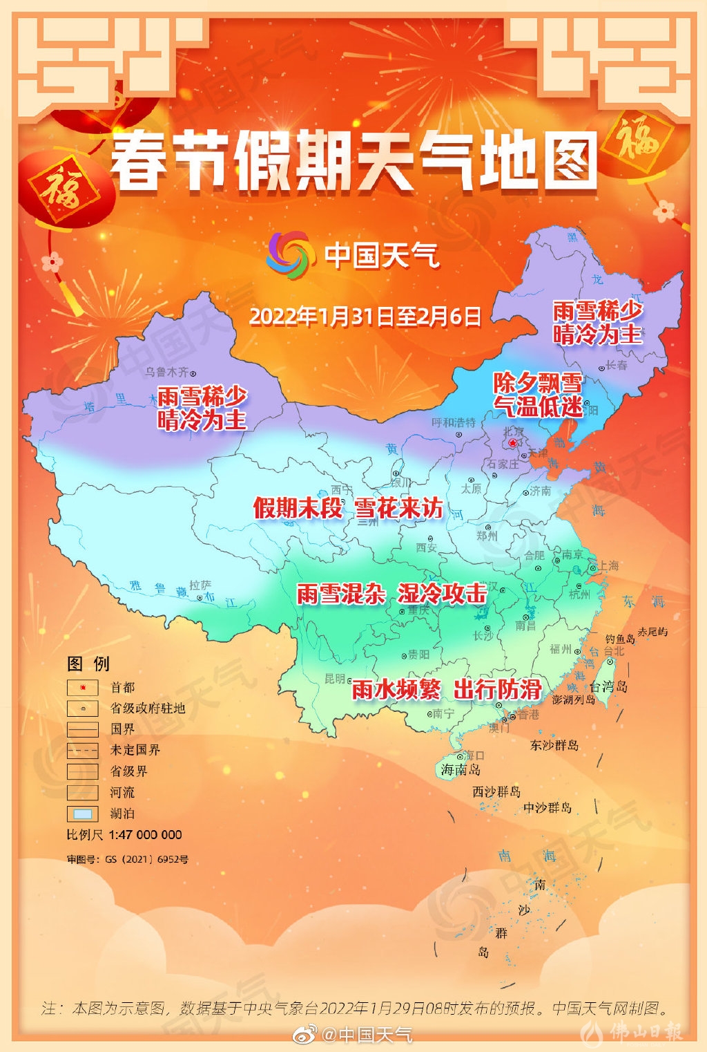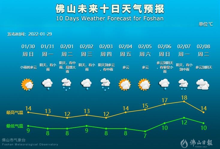 佛山市气象台1月29日预报,1月30日小雨转多云,部分时间可见阳光,气温9℃~14℃,可抓紧时间洗晒。而今年春节假期佛山市天气复杂多变,先有湿冷魔法攻击,后有干冷迅速补位,之后湿冷再度上线:除夕(1月31日)有小雨;初一到初三(2月1日~3日)有中雨,日温差小;初四到初五(2月4日~5日)转多云,昼夜温差大,早晚气温低,2月5日早晨将出现本次过程最低气温7℃左右;初六(2月6日)再转有阴雨。