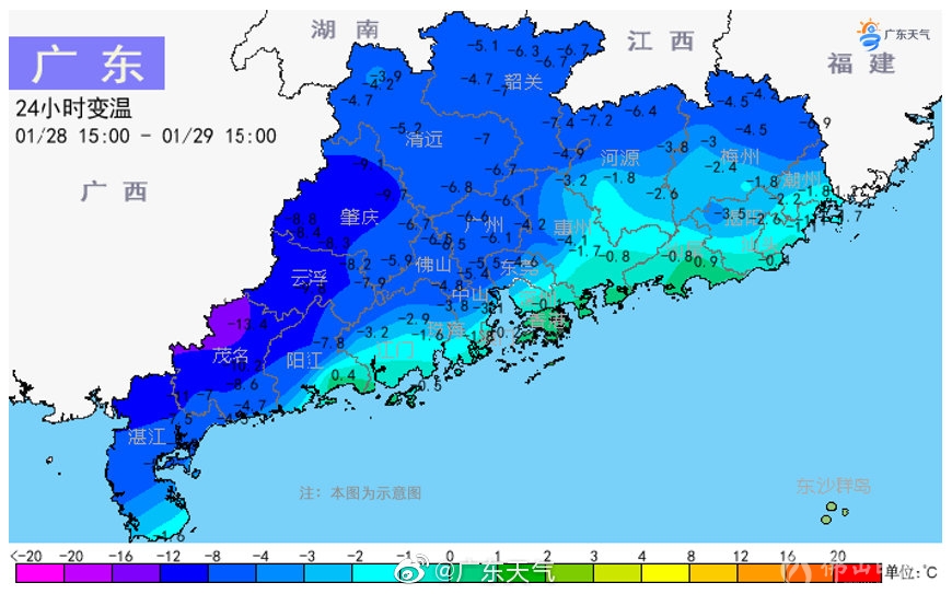 1月29日,强冷空气自北向南影响广东,佛山市气温持续下降,15时气温介乎11℃~14.5℃,较前一日同期下降了5.4℃~6.5℃。佛山市气象台1月29日9时45分发布全市寒冷黄色预警信号,预计佛山市气温继续下降,天气持续寒冷。