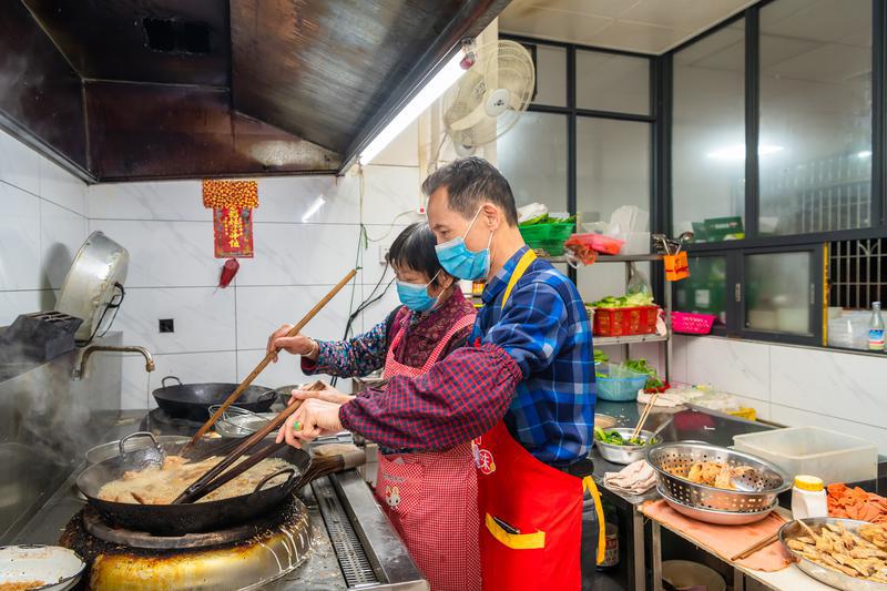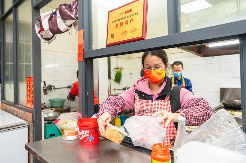 位于三水区西南街道的河口大家乐小吃店已经营业了30多年,每天食客络绎不绝,厨房内工作人员正在帮食客打包。佛山日报记者王澍摄