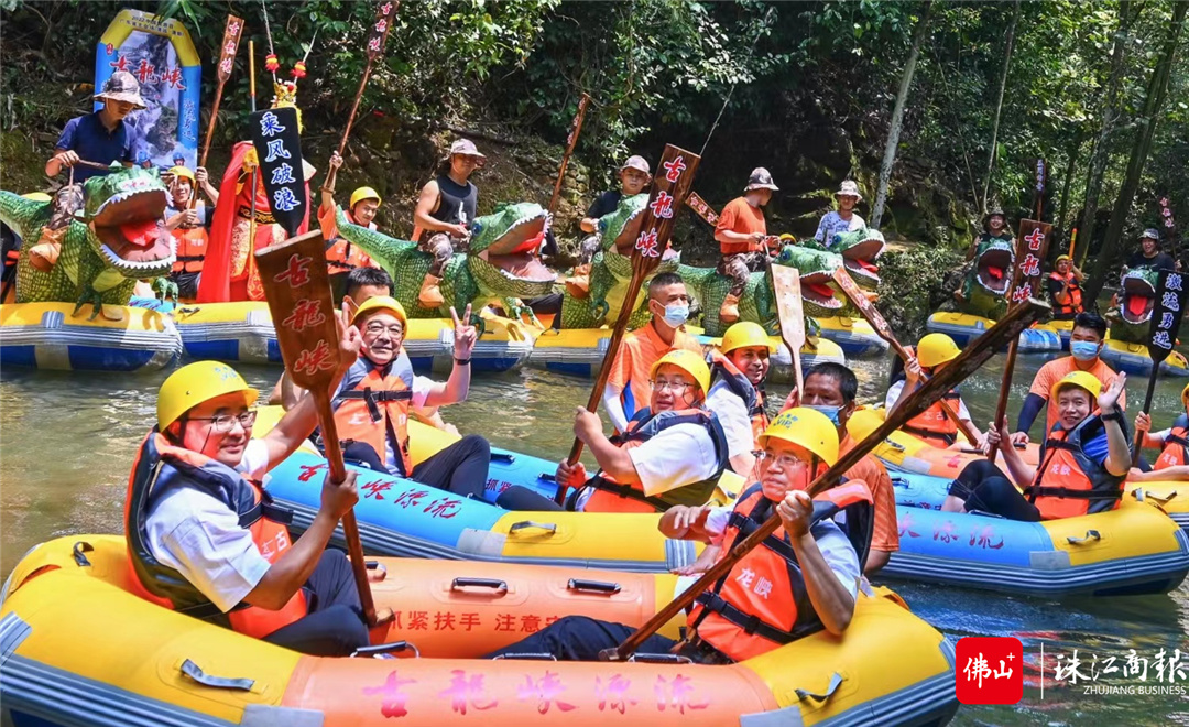 在古龙峡景区总经理欧敬欢、常务副总经理焦德强陪同下,广东省文化和旅游厅副厅长曾晓峰(二艇左)与清远市政府副市长苏锦丹(前艇右)领漂清远开漂节。