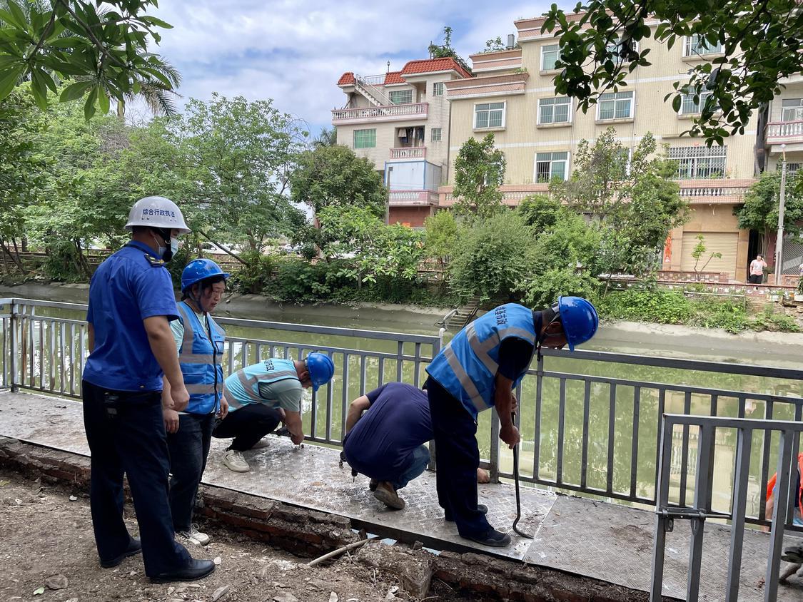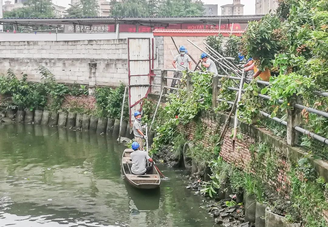 顺德区在乐从镇路州环村涌开展“清四乱”行动,拆除乱占建筑。