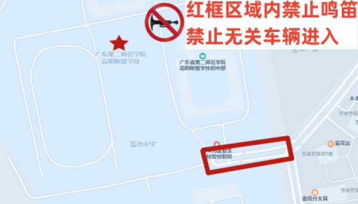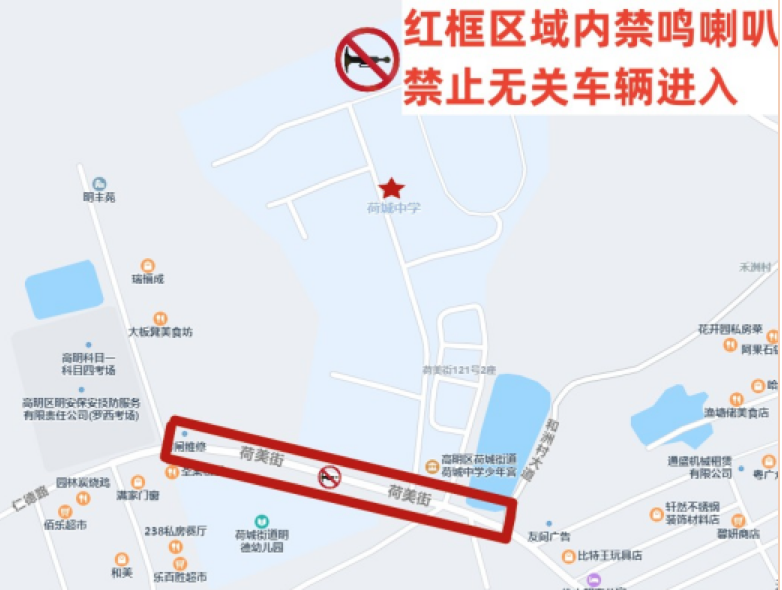 荷美街(学校前路段)禁止无关车辆进入,机动车禁鸣喇叭。