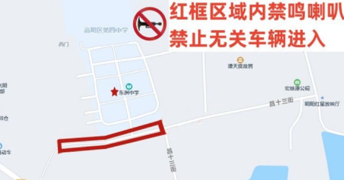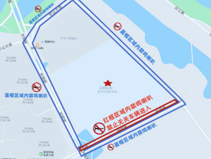 昌十三街(学校前路段)禁止无关车辆进入,机动车禁鸣喇叭。