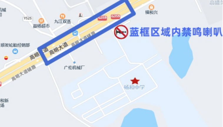 高明大道(学校前路段)机动车禁鸣喇叭。