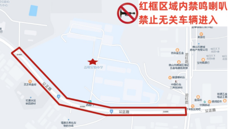 公正路(学校前路段)禁止无关车辆进入,机动车禁鸣喇叭。