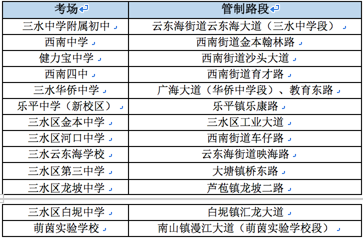 西樵辖区考场设在西樵中学、樵北中学、太平中学、听音湖实验学校。交警部门将加强考场周边路段的巡查,对相关路段进行管控。其中,太平中学门前龙门架至榕树头路段实施交通管制,需在管制时段内途经该路段的车辆,请绕行太平路。