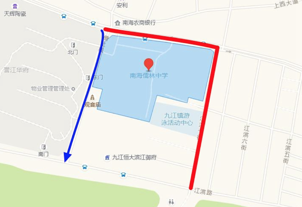 新堤西路(誉江华府至洛口社区民警中队)实施单边封闭,禁止车辆通行;江滨七街路段封闭,禁止通行;观音庙路段由北往南向江滨路方向实施单向行驶,供绕行车辆通行;位于学校路段范围的九江镇游泳活动中心也在交通管制范围内。