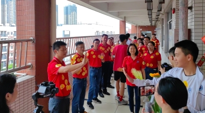 南外老师身穿红色送考服,身上贴满了“满分”的标签,祝福学生旗开得胜。