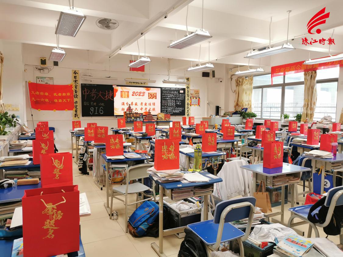 在课室桌面上摆放红色礼品袋,寓意金榜题名。