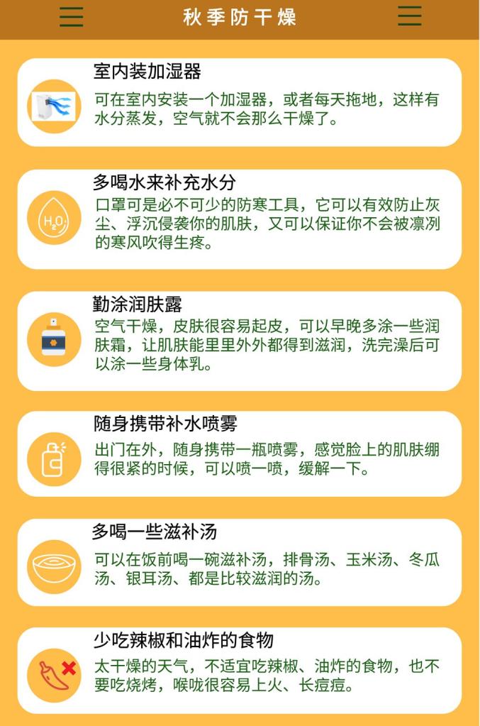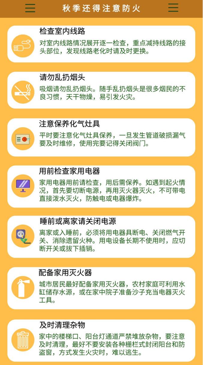 未来一段时间,佛山天气持续晴燥,宜洗晒、宜秋游;昼夜温差较大,早出晚归的市民要注意适时添衣保暖。全市五区森林火险橙色预警信号正在生效,近期白天最低相对湿度可能只有30%,市民要及时补充水分以防秋燥,同时注意森林防火和家居用火用电安全。