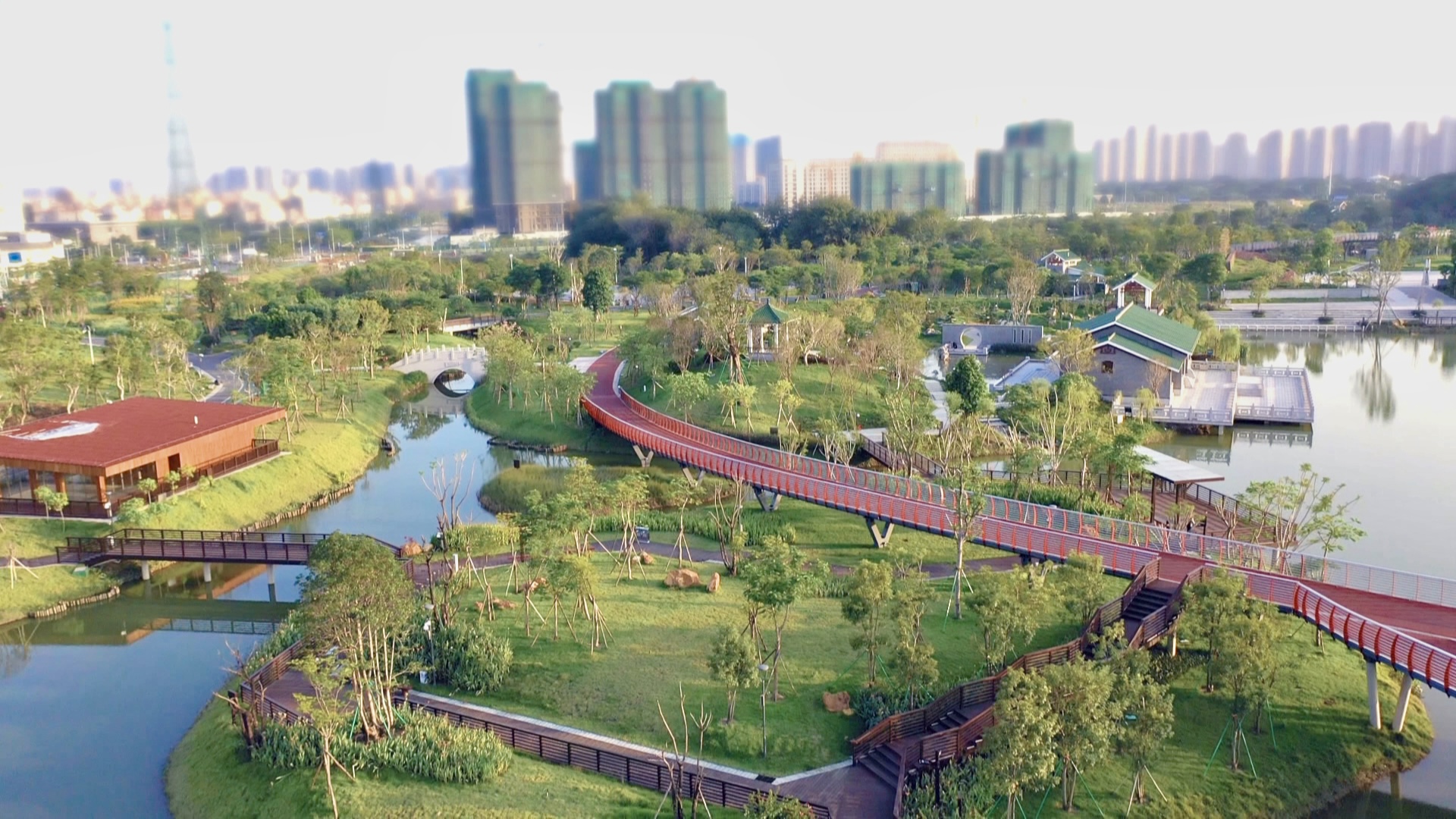 位于张槎街道的王借岗森林公园总规划面积约70万平方米,是佛山市千亩生态绿心群的核心公园之一,这里集合了火山遗址景观、滨河湿地景观、综合公园景观于一体。步入公园内,可见绿道宽敞整洁,休憩亭台典雅精致,碧湖、蓝天、绿植、栈道相映成趣,令人身心舒畅。