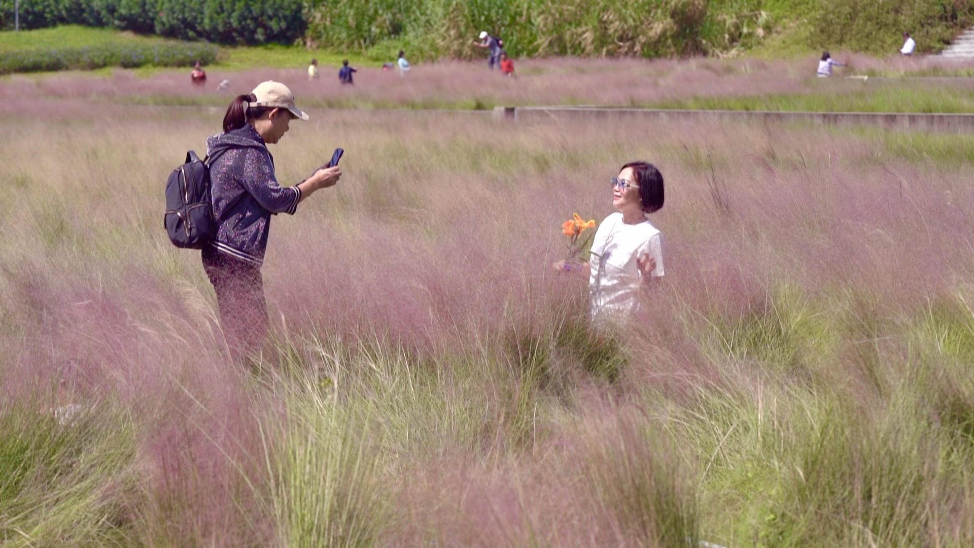 市民来到粉黛乱子草花海打卡拍照。/佛山市新闻传媒中心记者杨俊华、 江金鸿