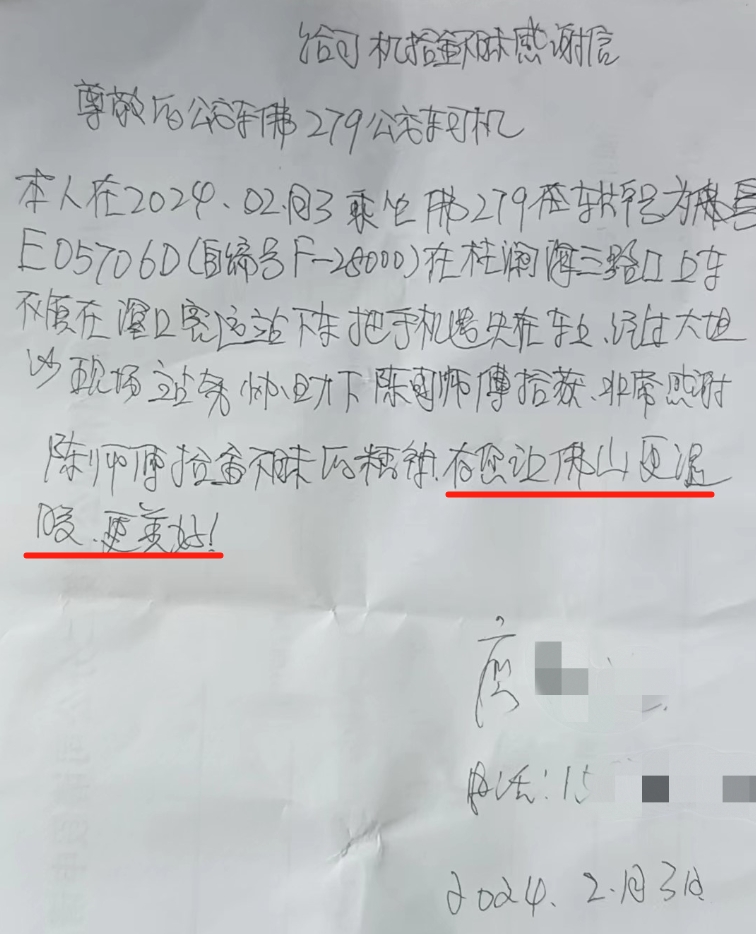 无独有偶,2月3日下午,发生感人一幕。巴士集团佛广集团桂城分公司279线公交车长陈水清拾获手机并归还给乘客廖先生,乘客廖先生当场写下感谢信,大赞道:“非常感谢陈车长拾金不昧的精神。有您,让佛山更温暖、更美好!”