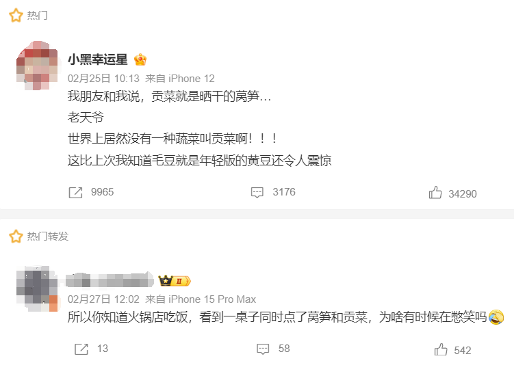 2月28日下午,话题#贡菜就是晒干的莴笋#登上微博热搜第一,很多网友对此表示非常震惊,“世界上居然没有一种蔬菜叫贡菜!”